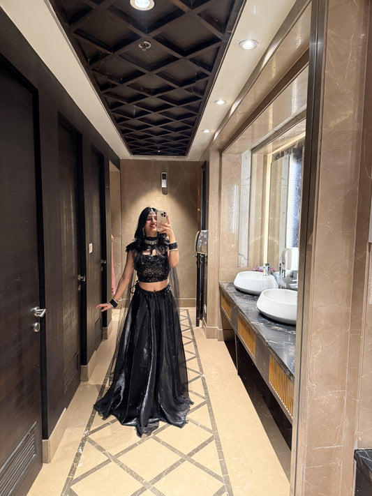 Sold outBlack Satin Starry Night Lehenga Set